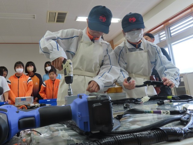 その後、工場での作業服を着てみたり、実際の車の部品を使った、組み立て体験をしたりしました。