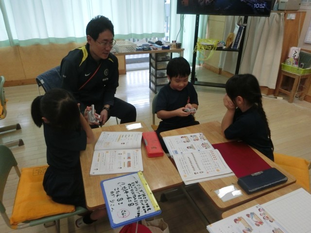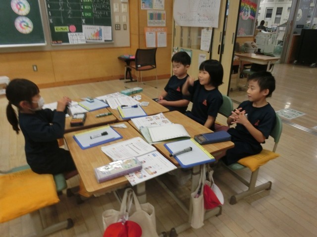 1Aの算数では、計算カードを使って、友達と問題を出し合いながら学習をしていました。とても楽しそうな雰囲気でした。