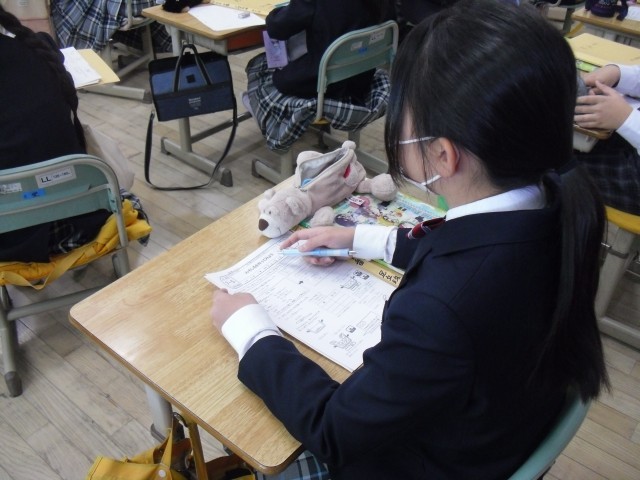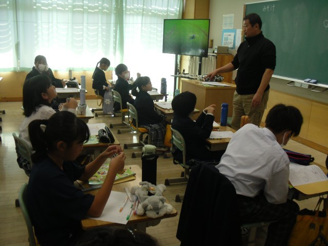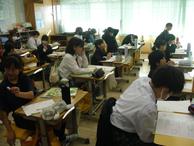 5Aにお家庭科では、味噌汁づくりの調理実習に向けて、味噌汁づくりに必要な材料や手順について学習していました。