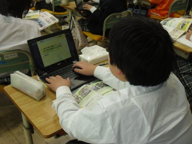 今日は、工場の工夫について、気付いたことを出し合いながら、考えをまとめ、深めていました。