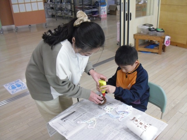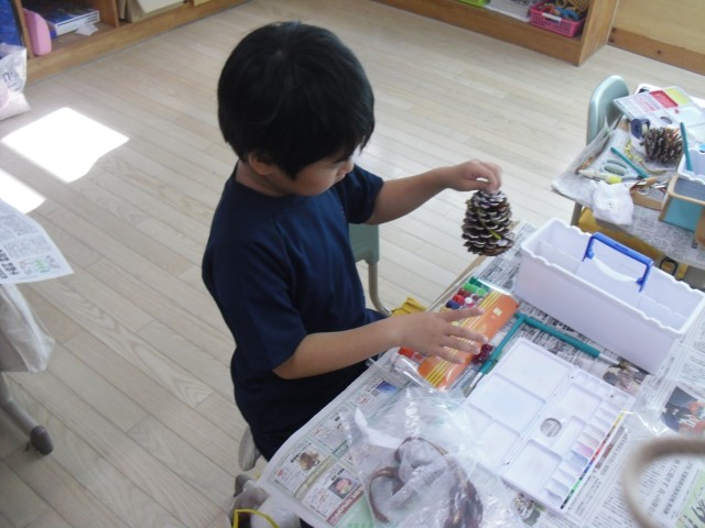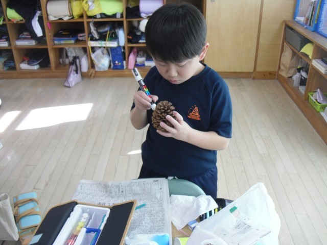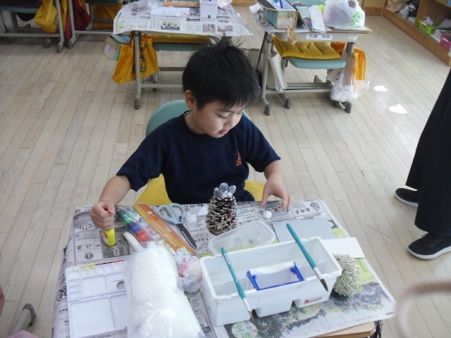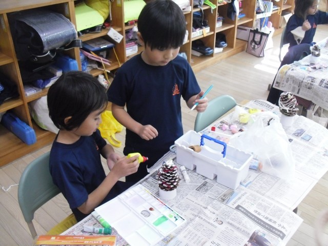 大きな松ぼっくりに色をつけたり、綺麗に飾り付けをしたりしてお気に入りのツリーを作っていました。