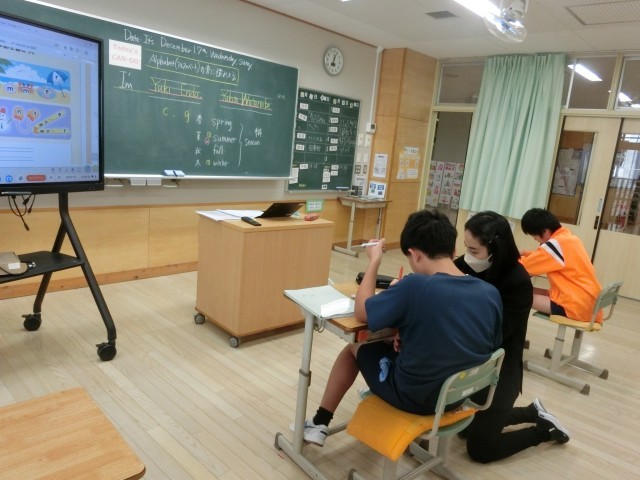 中Cの英語の授業では、生徒たちが真剣な表情で学習に取り組んでいました。先生の丁寧な説明に耳を傾け、一つ一つ確認しながらノートに練習する姿が印象的でした。