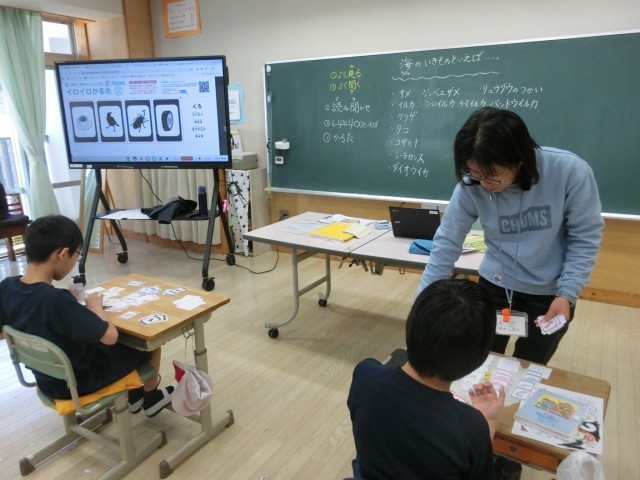小Cの読解では、「海のいきもの」から連想する言葉をたくさん出し合い、想像を広げながら学習を進めました。その後は、カルタを使って言葉に親しみ、楽しみながら語彙を増やす活動に取り組みました。和やかで楽しい雰囲気の中で学んでいました。