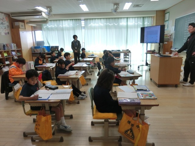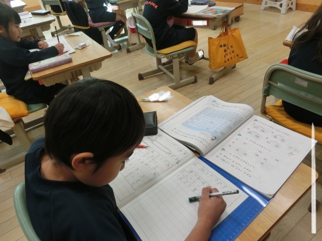 1Aの算数では、「100までの数」の学習を行っていました。表を見ながら気付いたことを発表し合い、「同じ数字がそろっている」「十の位が一つずつ増えている」など、数の並び方や規則性に目を向けました。先生の話をよく聞き、学習問題もノートに丁寧に書く姿が見られました。