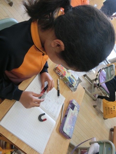 3Aの理科では、「じしゃくのてつを引きつける力は、どこが一番強い?」を調べる実験を行いました。自分の磁石を使い、くぎの付き方を比べたり、向きを変えて試したりと、さまざまな方法で確かめる姿が見られました。結果から気付いたことを共有しながら、意欲的に実験に取り組んでいました。