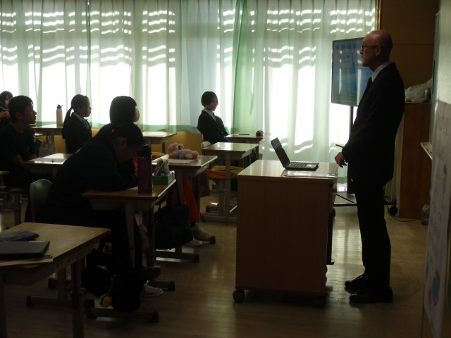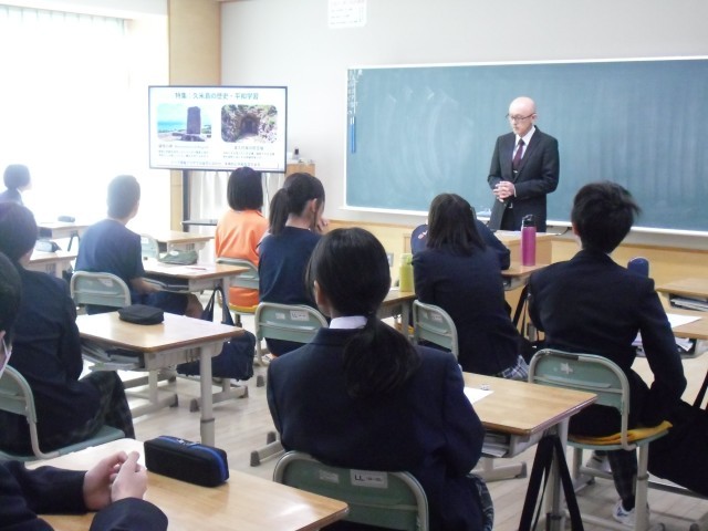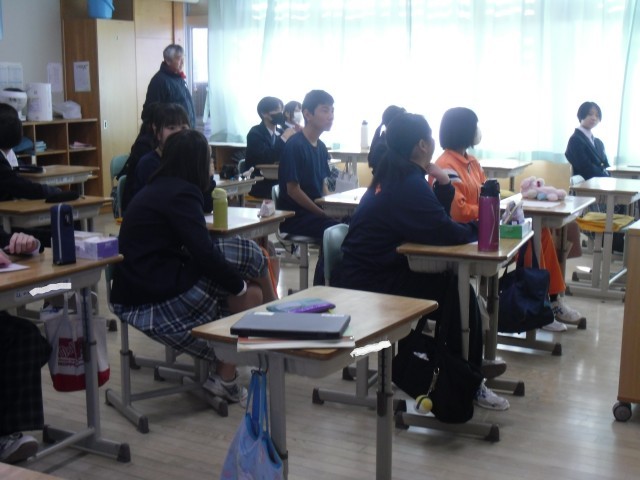 8Aの総合的な学習の時間では、9年生の4月にある久米島修学旅行に向けた学習を始めるに当たり、修学旅行の目的やスケジュールなどについて、校長先生から説明を受けました。