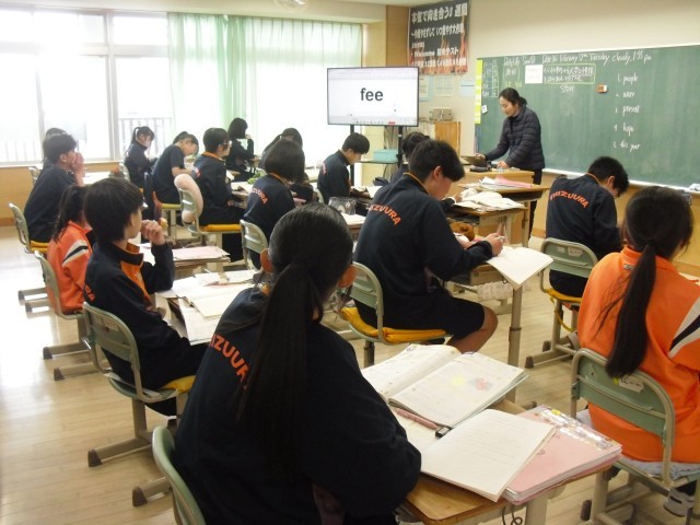 教師が新しい英単語を大型TVに映しながら、全員で発音や意味をを確認しながら、練習をしていました。