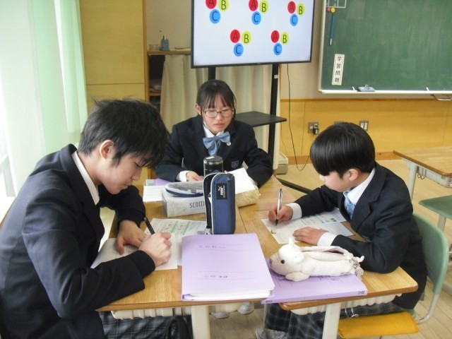 3人グループでABCの担当を決め、ジグソー学習を行っていました。