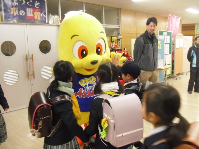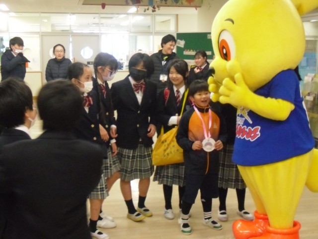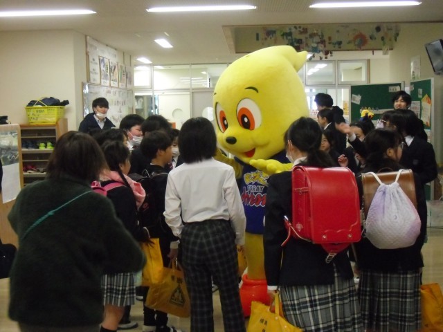 2月18日(水)の朝の挨拶運動では、いつもの自治会メンバーに加え、SVリーグの東レアローズ静岡からキャラクターのアロッチと元キャプテンで監督、現シニアマネージャーの篠田さんも来校し、一緒に挨拶運動をしてくださいました。
