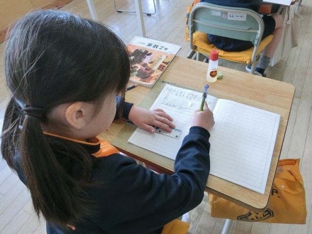 2A算数では、「たすのかな?ひくのかな?」と考えながら、テープ図を使って問題に取り組みました。図に表すことで場面が分かりやすくなり、式の意味をしっかり考えられるようになってきました。テープ図も上手にかけるようになっています。