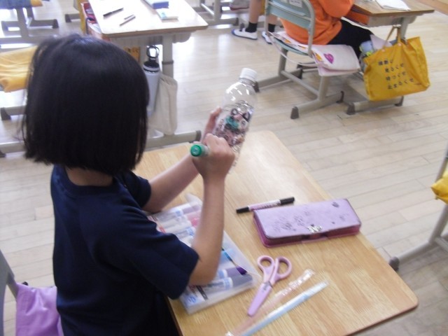 まず、それぞれがペットボトルに自分の気に入ったテーマに合わせて絵柄を付けました。