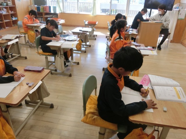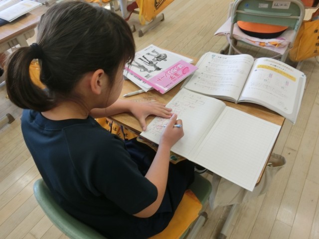 3Aの算数では、練習問題に取り組みました。子供たちは、一問一問に真剣に向き合い、ノートに丁寧に式や考え方を書きながら、集中して問題を解いていました。また、「ここはどうやるの?」「こう考えると分かりやすいよ」と、友達同士で自然に教え合う姿も見られました。