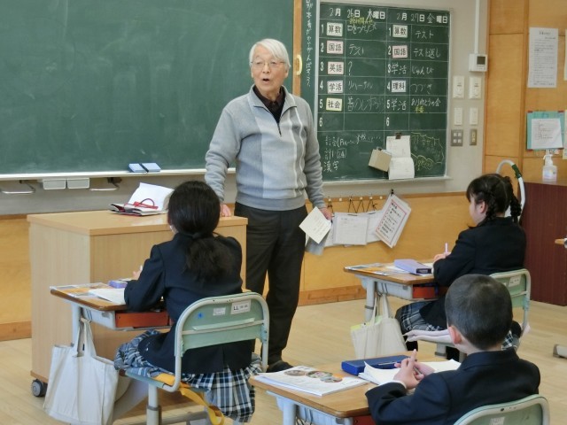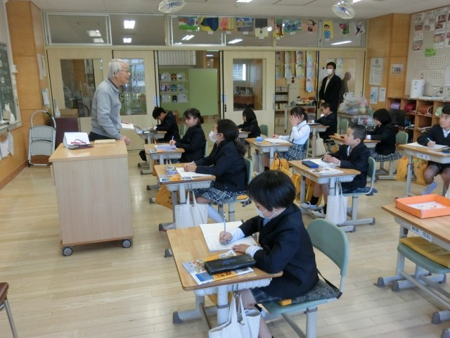 2月26日(木)、地域の方をお迎えし、「静浦の歴史」について学びました。静浦中学校時代には、同級生が250人いらしたことや、小学校4年生まで給食がなかったことを知り、子どもたちはとても驚いていました。