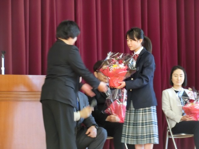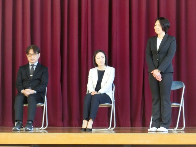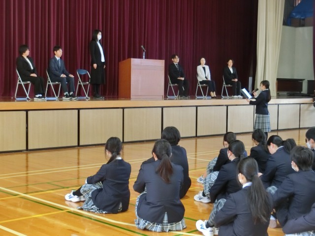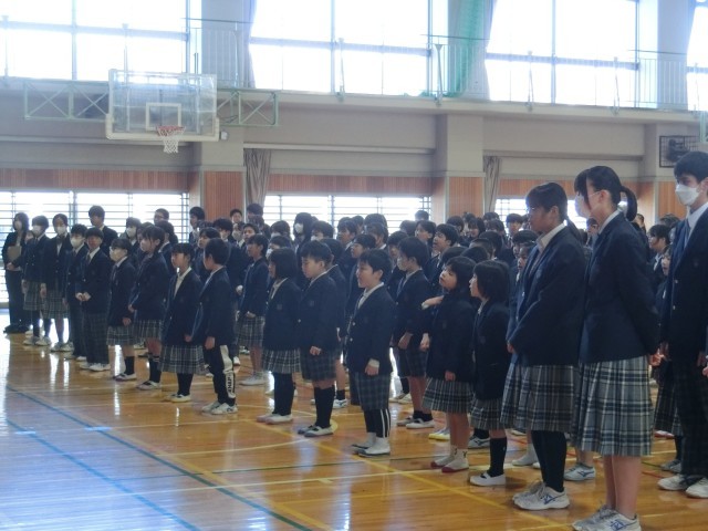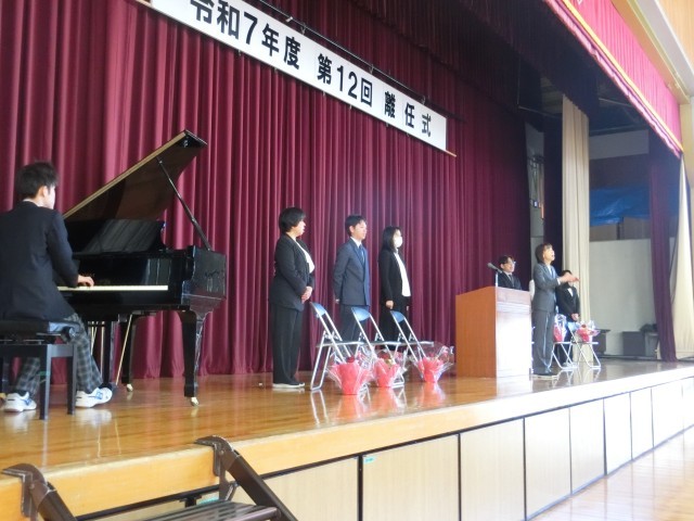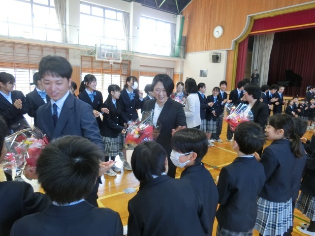 3月27日(金)、令和7年度の離任式が行われました。校長先生から、転任される職員一人一人の紹介があり、それぞれの先生方のこれまでのご尽力や思い出があたたかく語られました。児童生徒を代表して、感謝の気持ちを込めた言葉が一人一人の先生へ贈られ、会場は優しさに包まれました。また、代表の児童生徒から、心のこもったメッセージと共に、お花が手渡され、先生方も笑顔で受け取られていました。式の最後には、全員で校歌を歌い、その後、花道をつくって先生方をお見送りしました。大きな拍手の中、名残を惜しむように手を振る姿や、思わず涙を流す児童生徒の姿も見られ、別れのさみしさと感謝の気持ちがあふれるひとときとなりました。