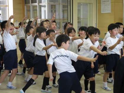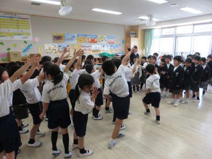 1,2年生の合同音楽の様子です。2年生の子どもたちが、1年生にいろいろなことを教えてあげています。