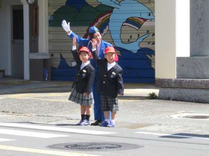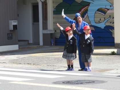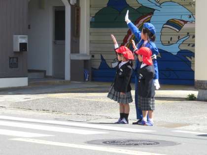 横断歩道は、右を見て、左を見て、もう一度右を見て渡りましょう。