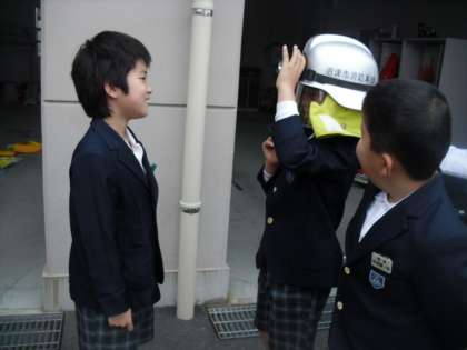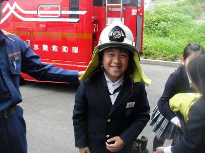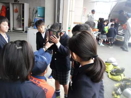 消防士さんが緊急時に装備するものを着用して、重さ等を確認しました。