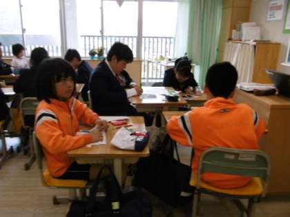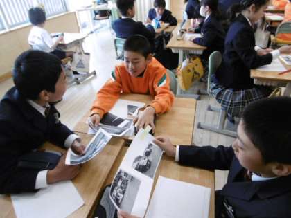 住んでいる地区ごとに集まり、自分たちで撮ってきた写真を見ながら通学路の問題点について話し合っています。危険箇所とその理由、気をつけることなどについてまとめていきます。