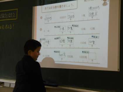 大きな数について、数直線を用いて学習しています。「1億、2億…」と、全員で確認していました。