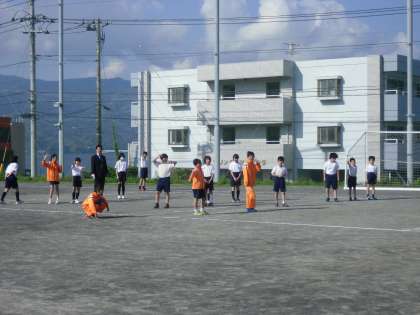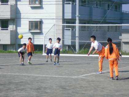 5年生が岡村先生と一緒にドッジボールをして楽しんでいました。
