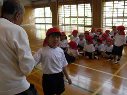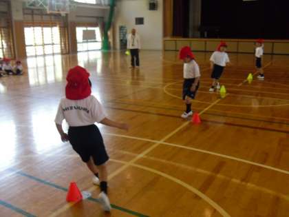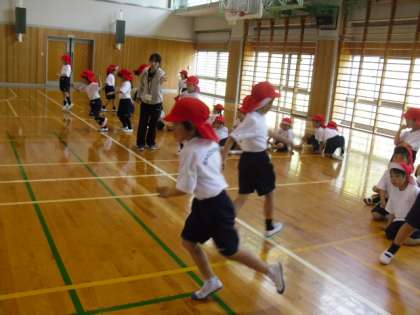 1年生は体育でリレーを行っていました。バトンタッチの仕方を教わった後、グループ対抗のリレーがスタートしました。