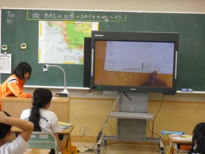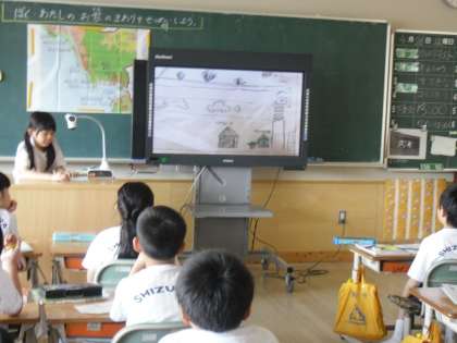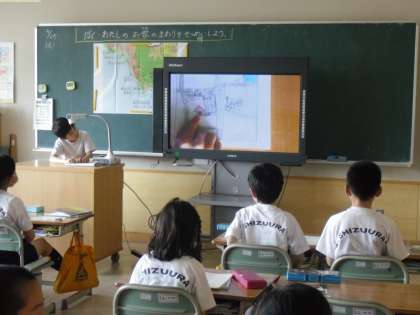 3年生は社会で「ぼく・わたしのお家のまわりを説明しよう」と言う学習で、班ごと紹介しあった後、代表の子が実物投影機を使って自宅のまわりを紹介しました。