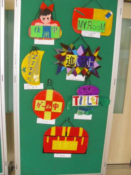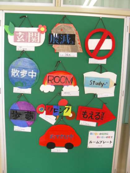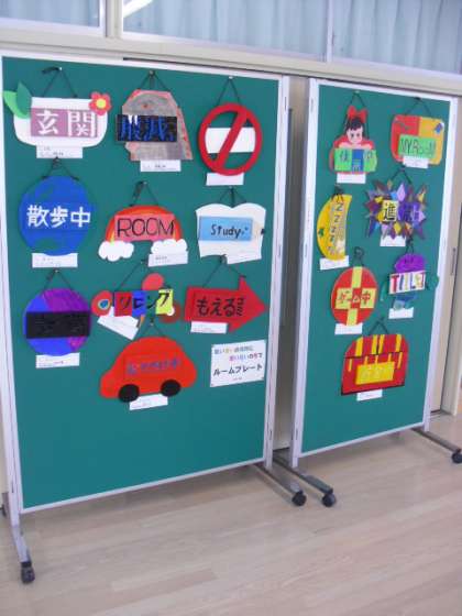 8A教室前廊下(コモンスペース)に8Aの生徒が制作したルームプレートが掲示されています。なかなかの出来映えです。