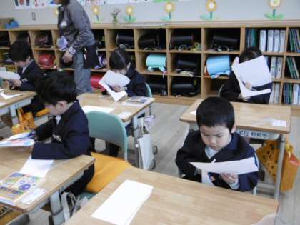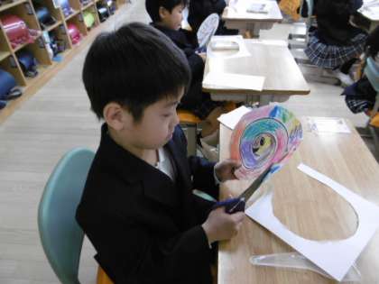 初めてのはさみの学習です。先生のお手本を見た後、真剣な表情で「カラフルへびさん」を作っています。