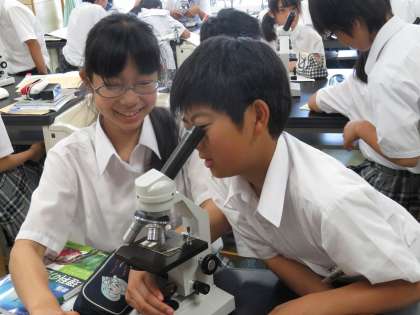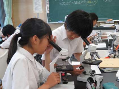 7A理科 植物の茎、根のつくりと働きを調べていこう。顕微鏡で調べています。