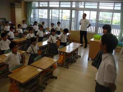 先週から始まった部活動激励会のための応援練習の様子です。7年生の応援団員が1年生に丁寧に指導しています。1年生は7年生を真似て、体を反らせながら声を張りあげていました。