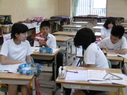 「リズムアンサンブル作り」を行っています。音を鳴らしながら創作を行っていました。授業では自然な対話が生まれていました。