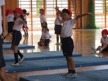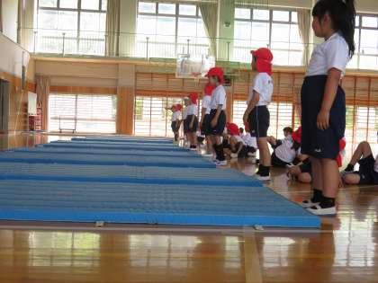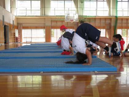 2A体育 マット運動を体育館で実施しています。ポーズも決まりました。