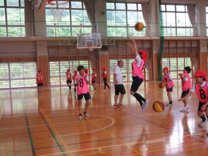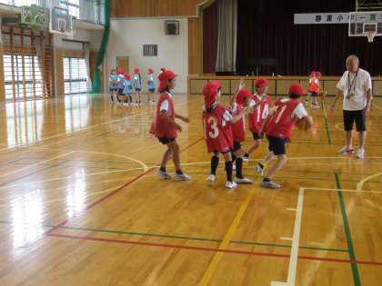 5A体育 バスケットボールです。5年生は人数が多いので、正先生、江本先生のTTです。