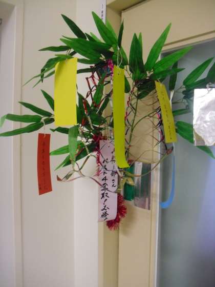 保健室入り口に七夕飾りがあります。みんなの願いごとが叶いますように。