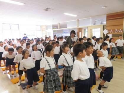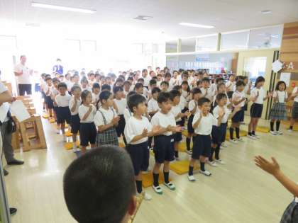 本日は志部集会の様子です。初志部は服装チェック、持ち物確認の後、応援練習です。素晴らしい声が響いています。