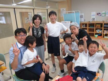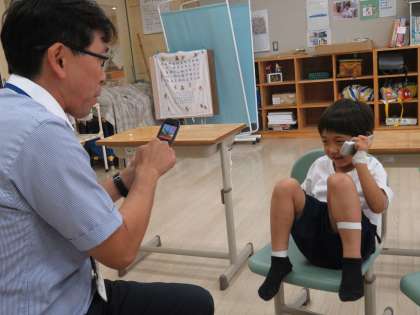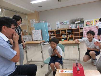 なにやら中野教頭先生とおもちゃの携帯で話しているようですね。