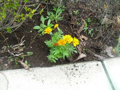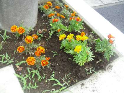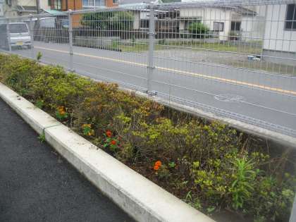 先日、沼津市都市部緑地公園課よりいただいた花苗(マリーゴールド・モスローゼ)を花壇に植えました。オレンジ色のマリーゴールドがよく映えます。