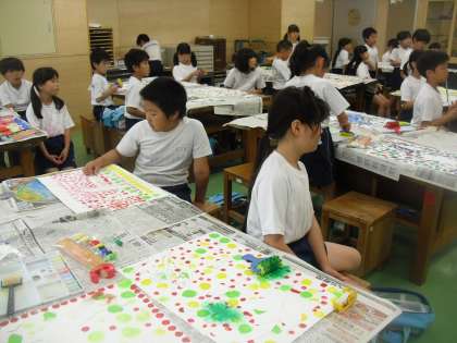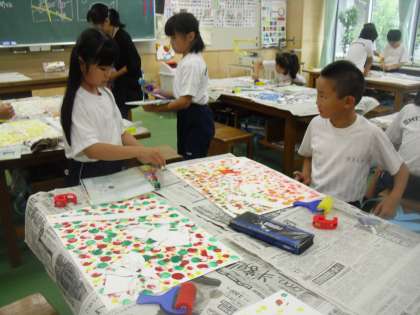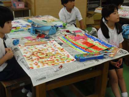 3年生は図工で「ステンシルローラー版画」を行っていました。子どもたちはローラーを転がし、色つけを楽しんでいました。