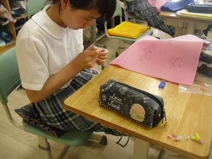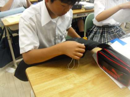7年生は家庭科で刺繍を行っていました。今日は刺繍糸3本以上を使って本返し縫いをしました。
