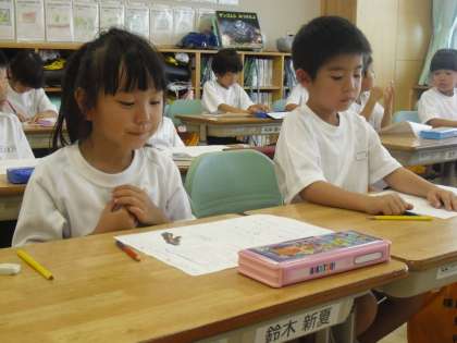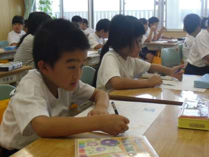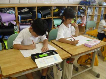 「これはなんのあしでしょう」に取り組んでいました。だちょう、あひる、らいおんのあしが登場してきます。上手に絵で描いている児童もたくさんいました。