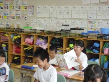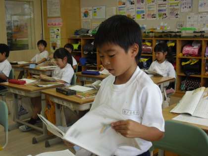 2年生は国語で「きつねのおきゃくさま」を学習しています。みんなで区切って読み合いました。