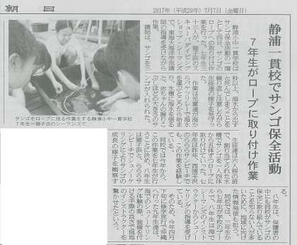4日に行った7年サンゴ学習について、7日付の沼津朝日新聞2面に内容が写真付きで掲載されています。
