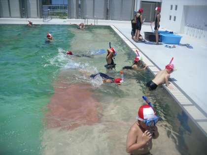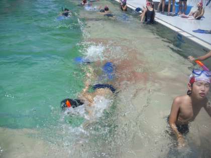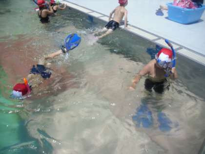 水中メガネとフィンを装着した子から学級担任も見守る中プールに入りました。みんな上手に泳いでいます。