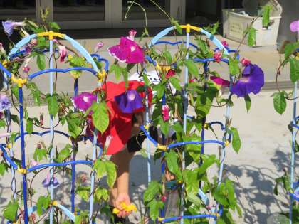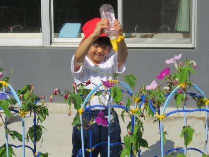 毎朝1年生が、あさがおに水をあげています。