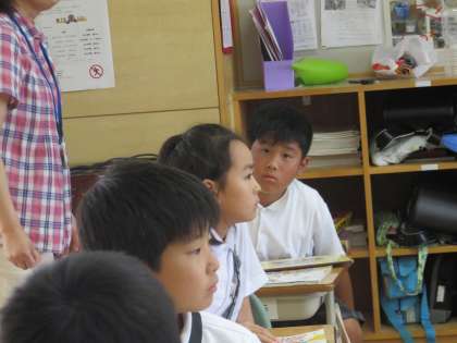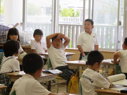 4A国語 本の人物を紹介しよう。自分が紹介したい人物の特徴を考えています。発表している子の方をみんなで聞いています。