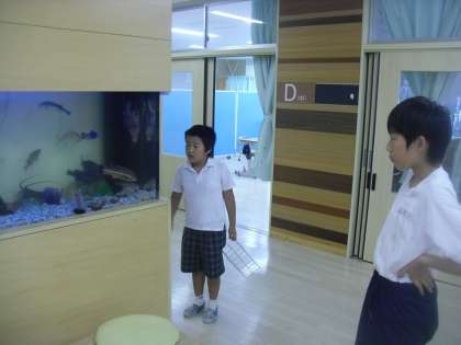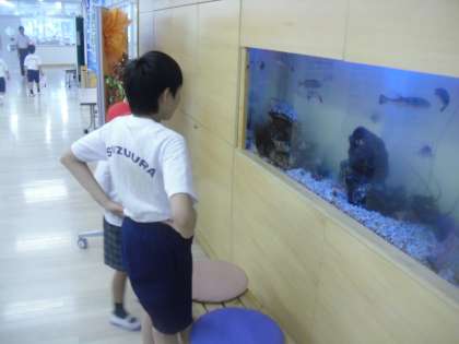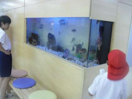 水槽内の大漁の魚が賑わいを見せ、子どもたちもいろいろな魚を興味深く見ています。