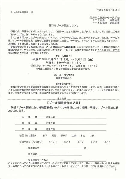 そこで最終締切を明後日13日(木)とします。追加でプール開放参加申込をする方は以前配布したお知らせに記入して学級担任に提出をお願いします。また、ホームページの配布文書のコーナーにPDFファイルを用意しましたので、そちらを利用してくださっても構いません。よろしくお願いします。