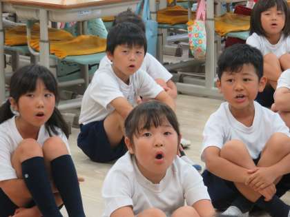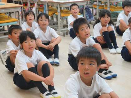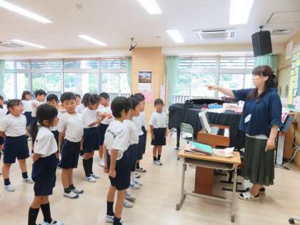 2A音楽 スイミーを楽しく歌っています。麻里子先生から口の開け方、声の出し方などの指示があっても修正して歌っています。2年生すごいですね。