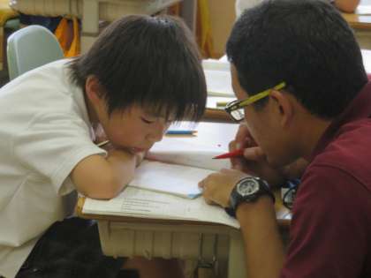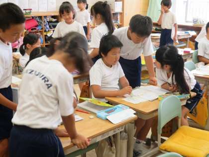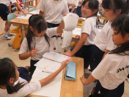 3A算数 表とグラフについて 資料を整理する方法を学習しています。友達と助け合いながら表の数値などを確認しています。