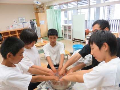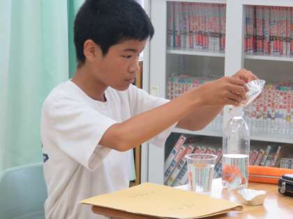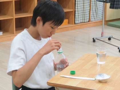 中D理科 炭酸数を作ろう クエン酸を利用して…。子どもたちがペットボトルに入れて持ち帰ります。最後は何をしているのでしょうか?楽しそうですね。先生も手を入れてみました。たいへん気持ちよかったです。
